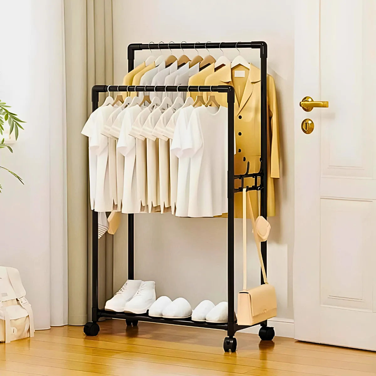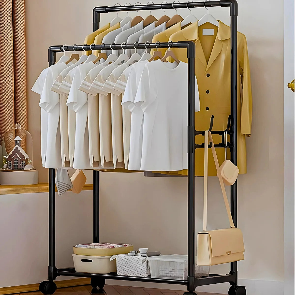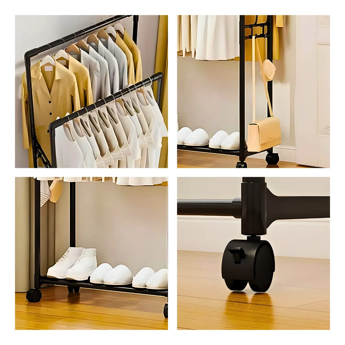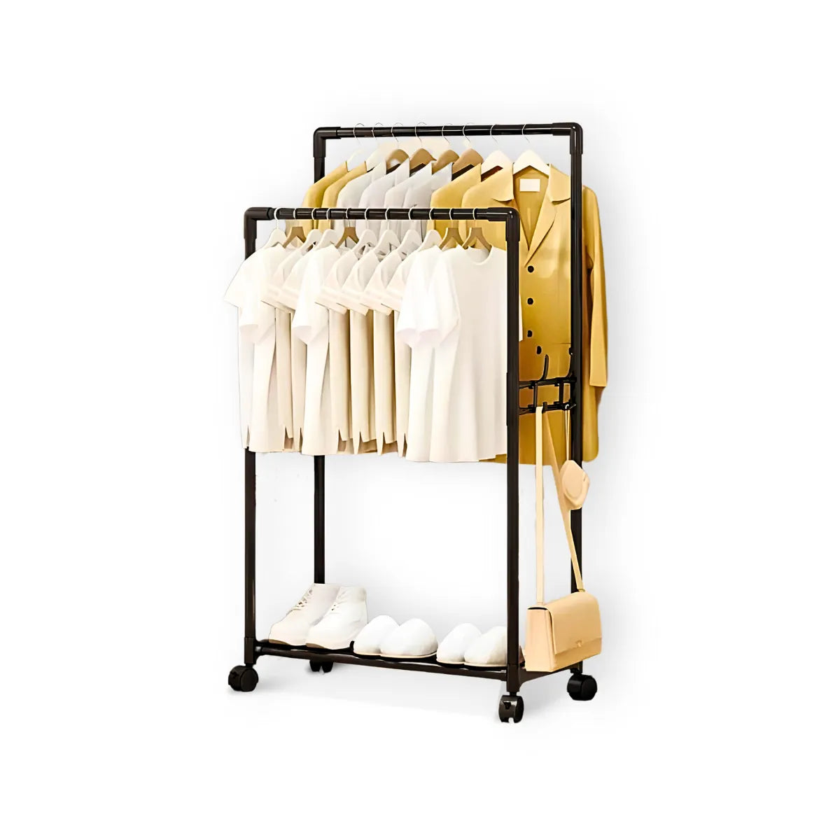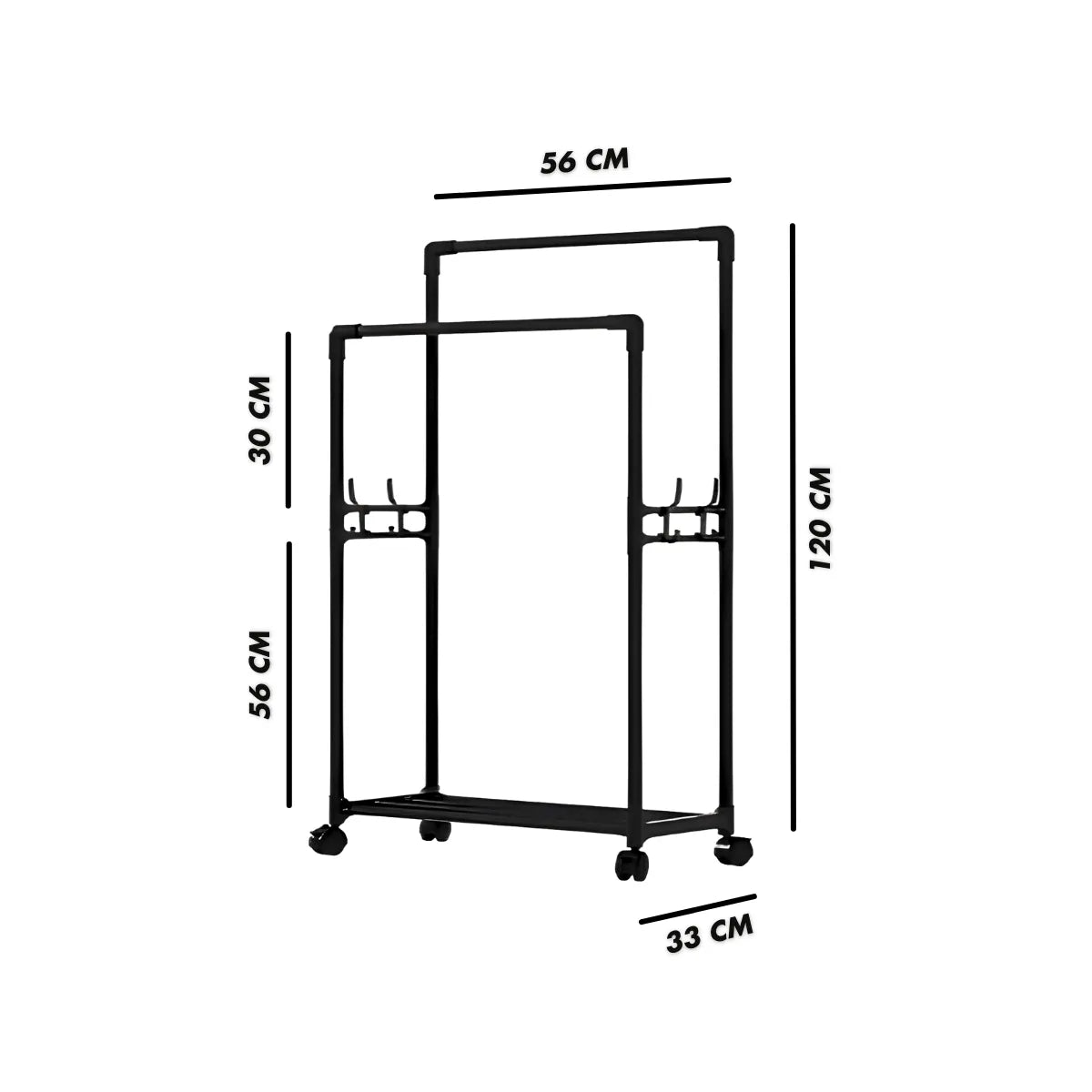 - Este cabideiro duplo oferece tudo o que você precisa para manter seus pertences organizados e acessíveis, com a praticidade de poder ser movido facilmente e sem ocupar muito espaço. Ideal para quem busca funcionalidade e estilo em um só produto.