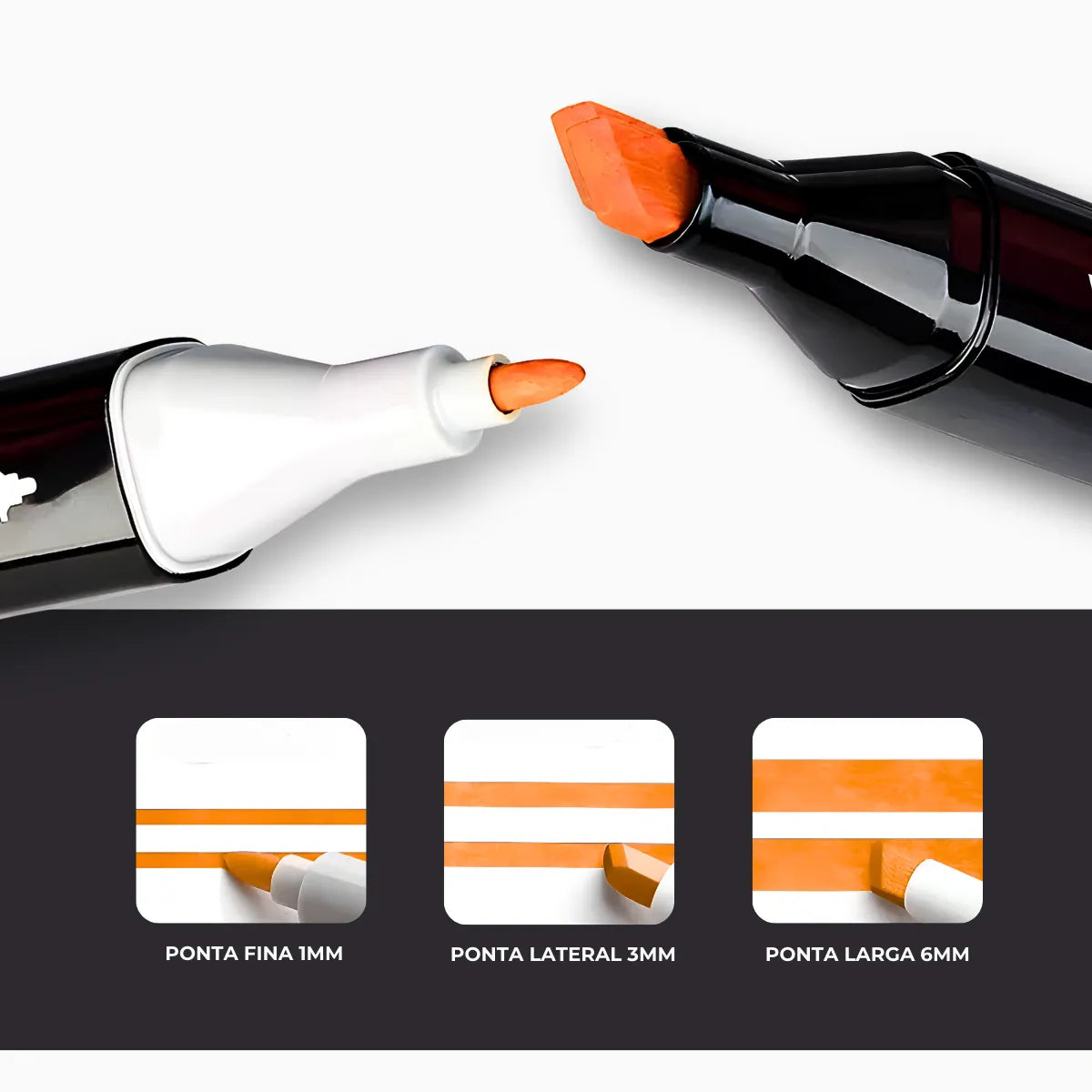 - Pontas Duplas : Cada caneta possui duas pontas: uma ponta fina para detalhes e linhas finas, e uma ponta de pincel, ideal para traços largos, sombreamento e preenchimento. A versatilidade das pontas garante máxima flexibilidade.